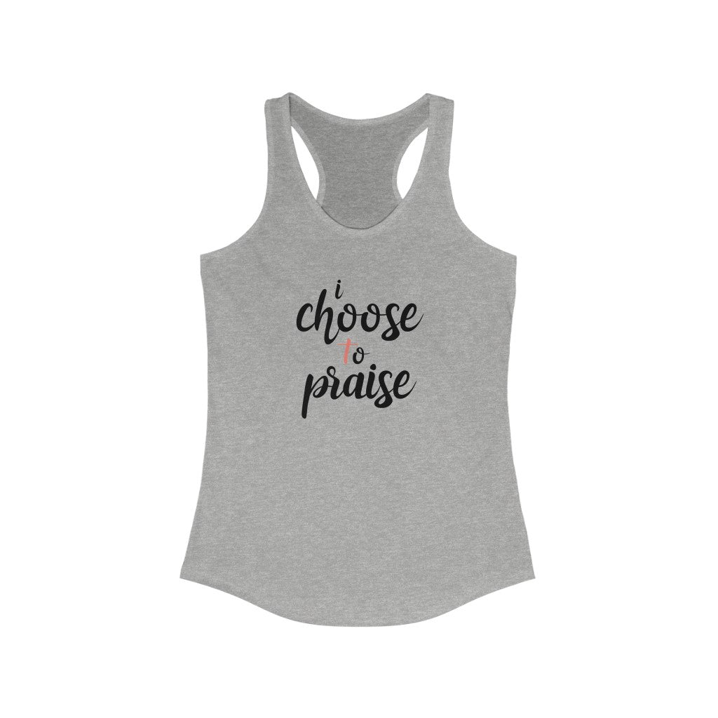 The new "I Choose to Praise" workout/casual tank is perfect for those hot summer days ahead! Be bold! High quality print of this slim fit tank-top will turn heads. And bystanders won't be disappointed - the racerback cut looks good on any woman's shoulders. .: 60% combed ringspun cotton, 40% polyester .: Extra light fabric .: Slim fit .: Tear away label .: Runs smaller than usual