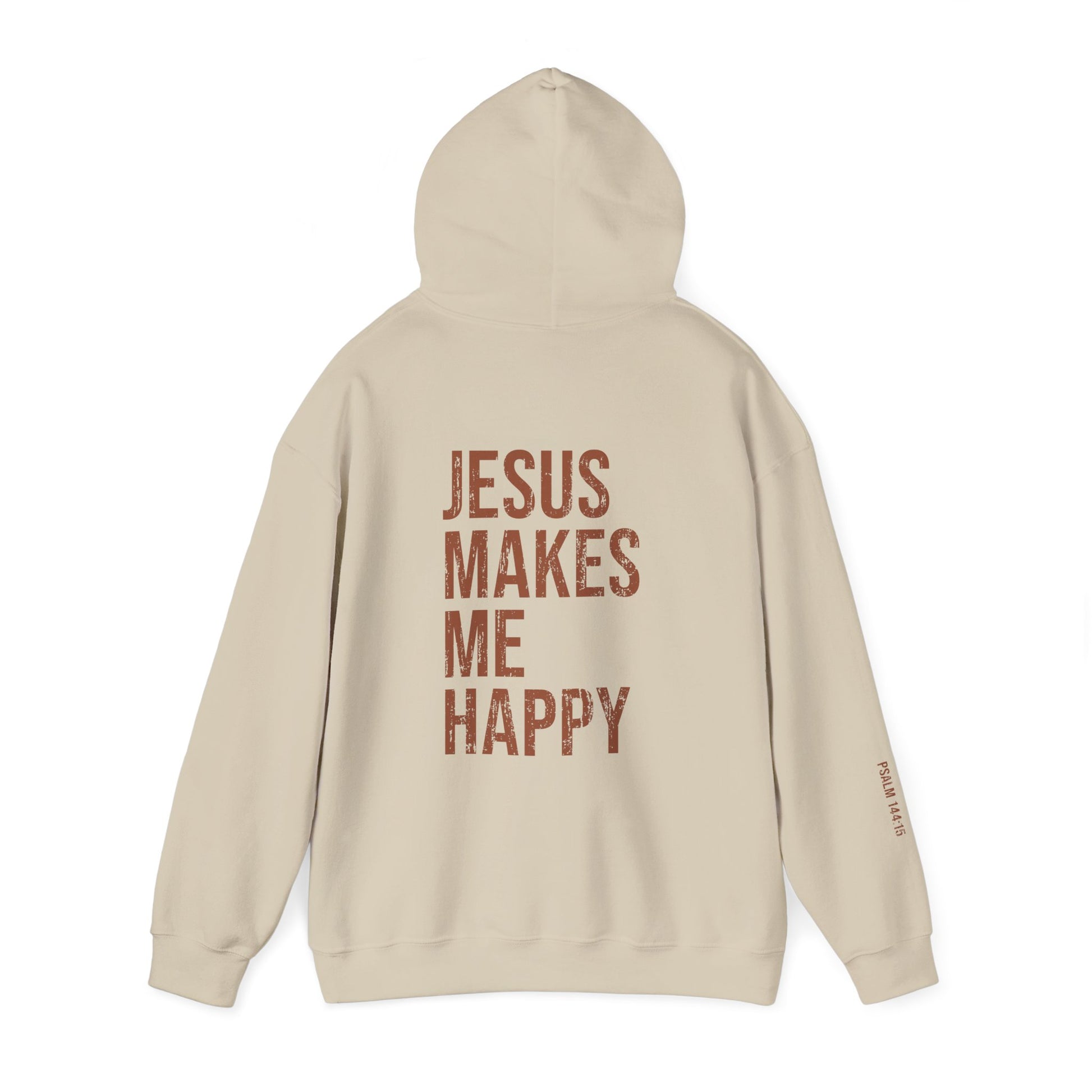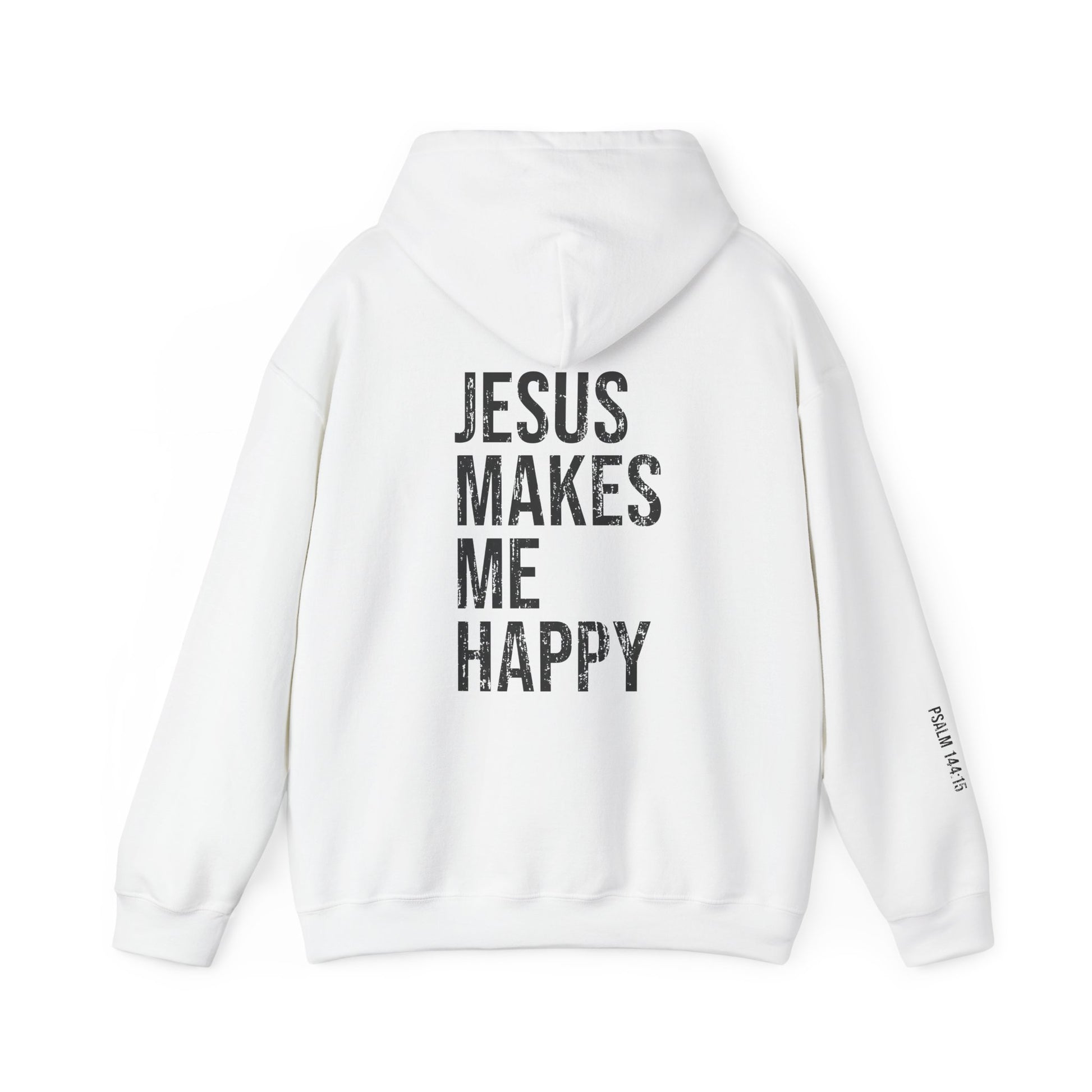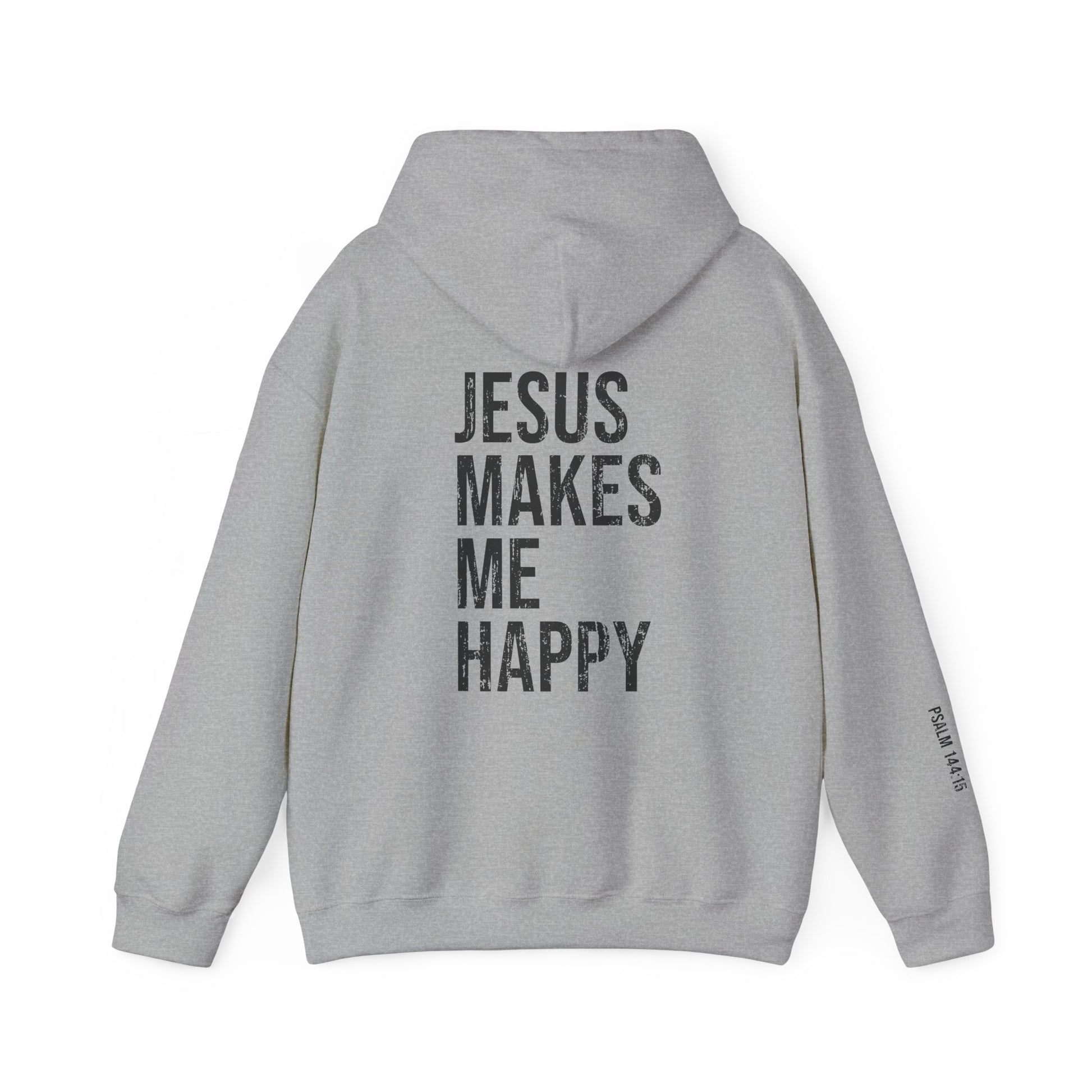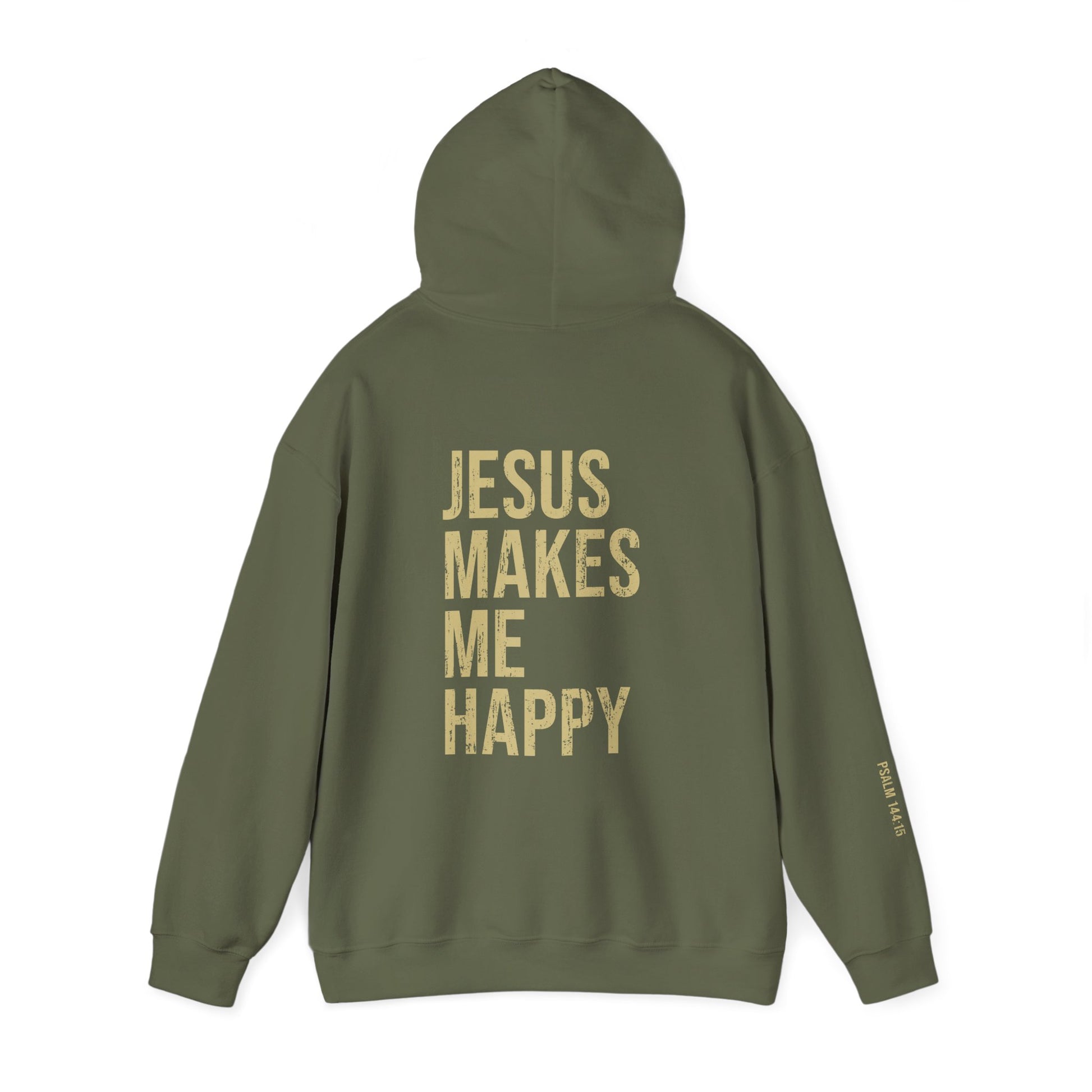 Based on Psalm 144:15 - "Happy are the people who are in such a state; Happy are the people whose God is the Lord!" Tell the world how you feel about your King! The Jesus Makes Me Happy message does just that. Psalm 144:15 printed on the right sleeve as well!