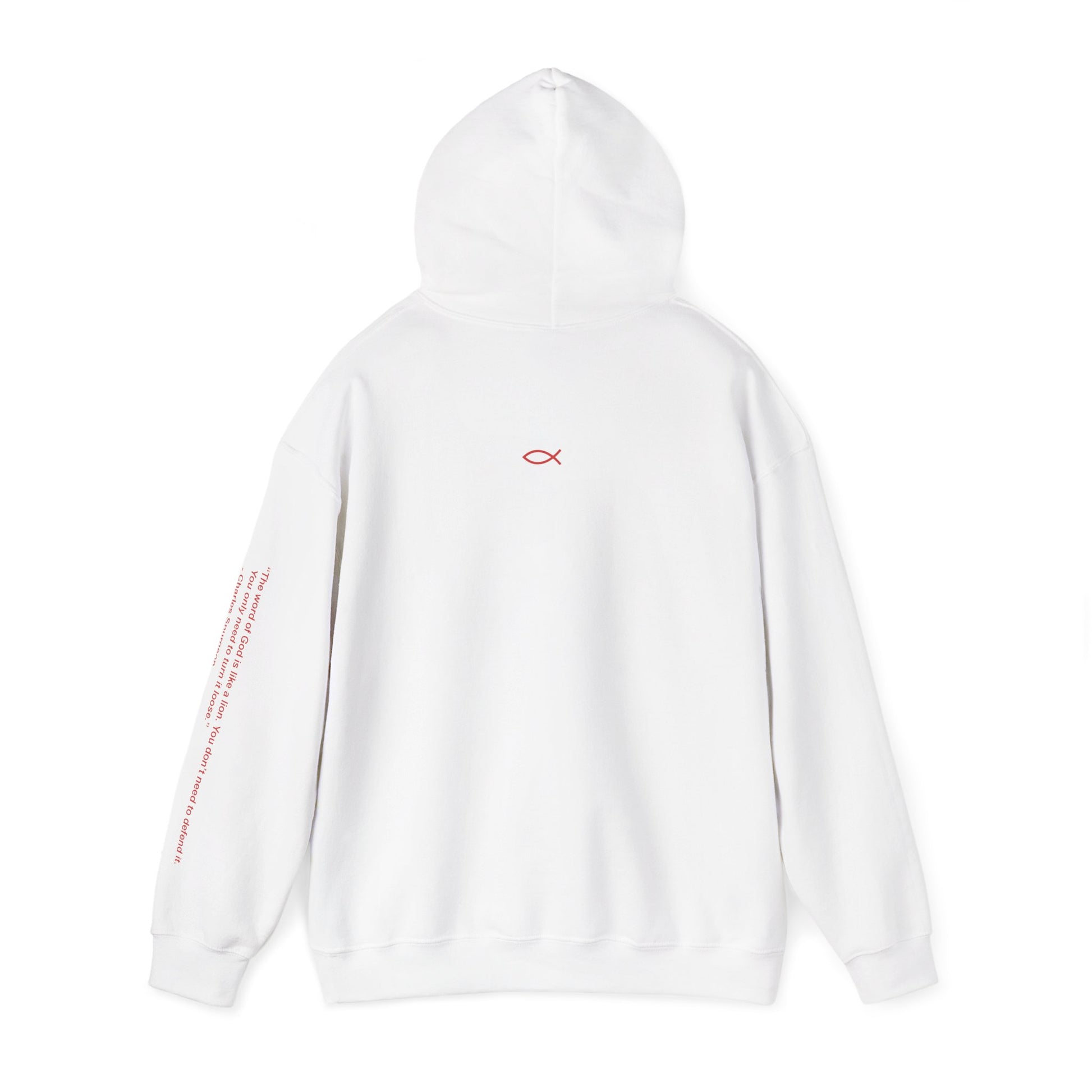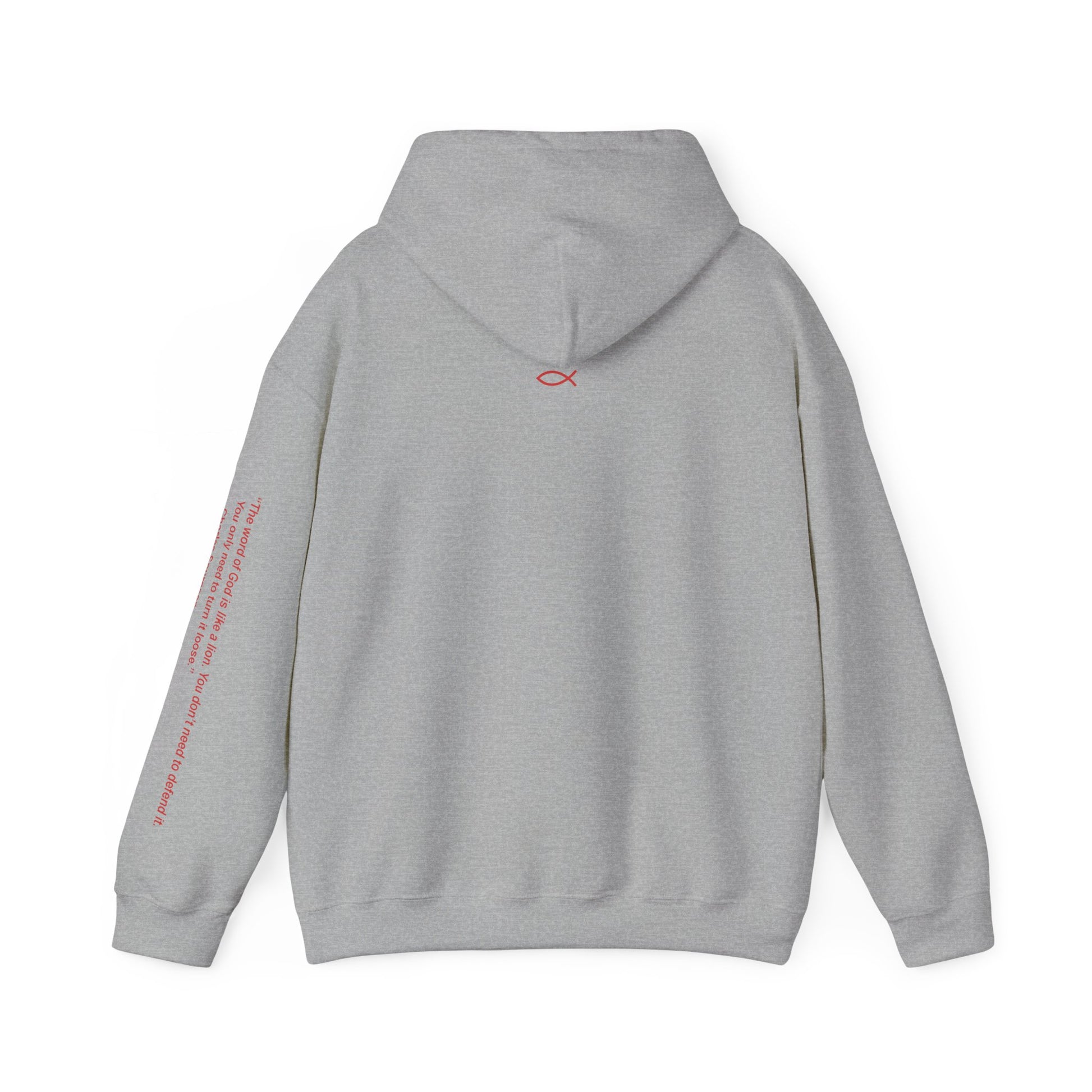 The Lion of Jodah sweatshirt is based on a quote from Charles Spurgeon. "The word of God is like a lion. You don't need to defend it. You only need to turn it loose." The left sleeve has this quote printed on it for all to see.